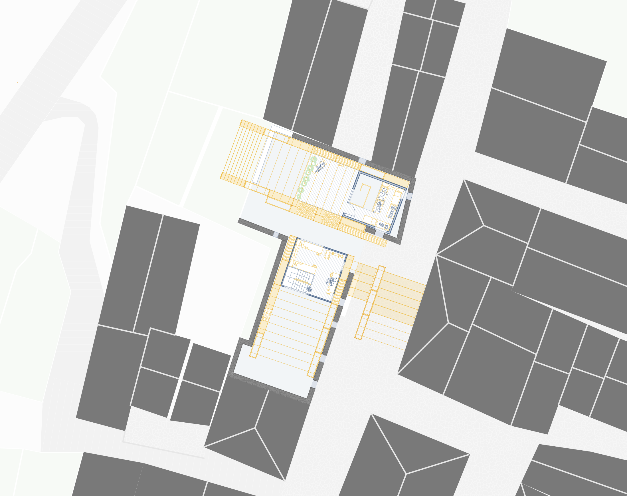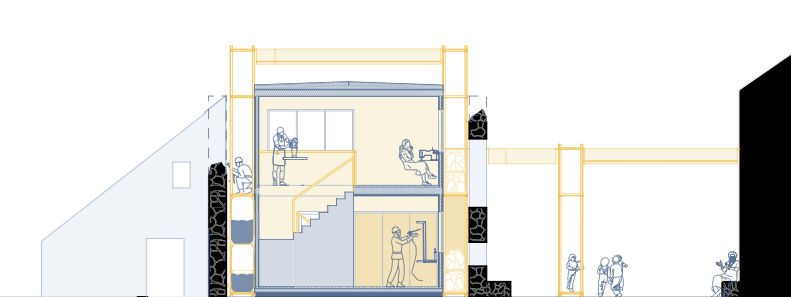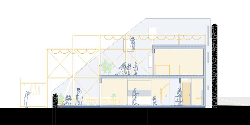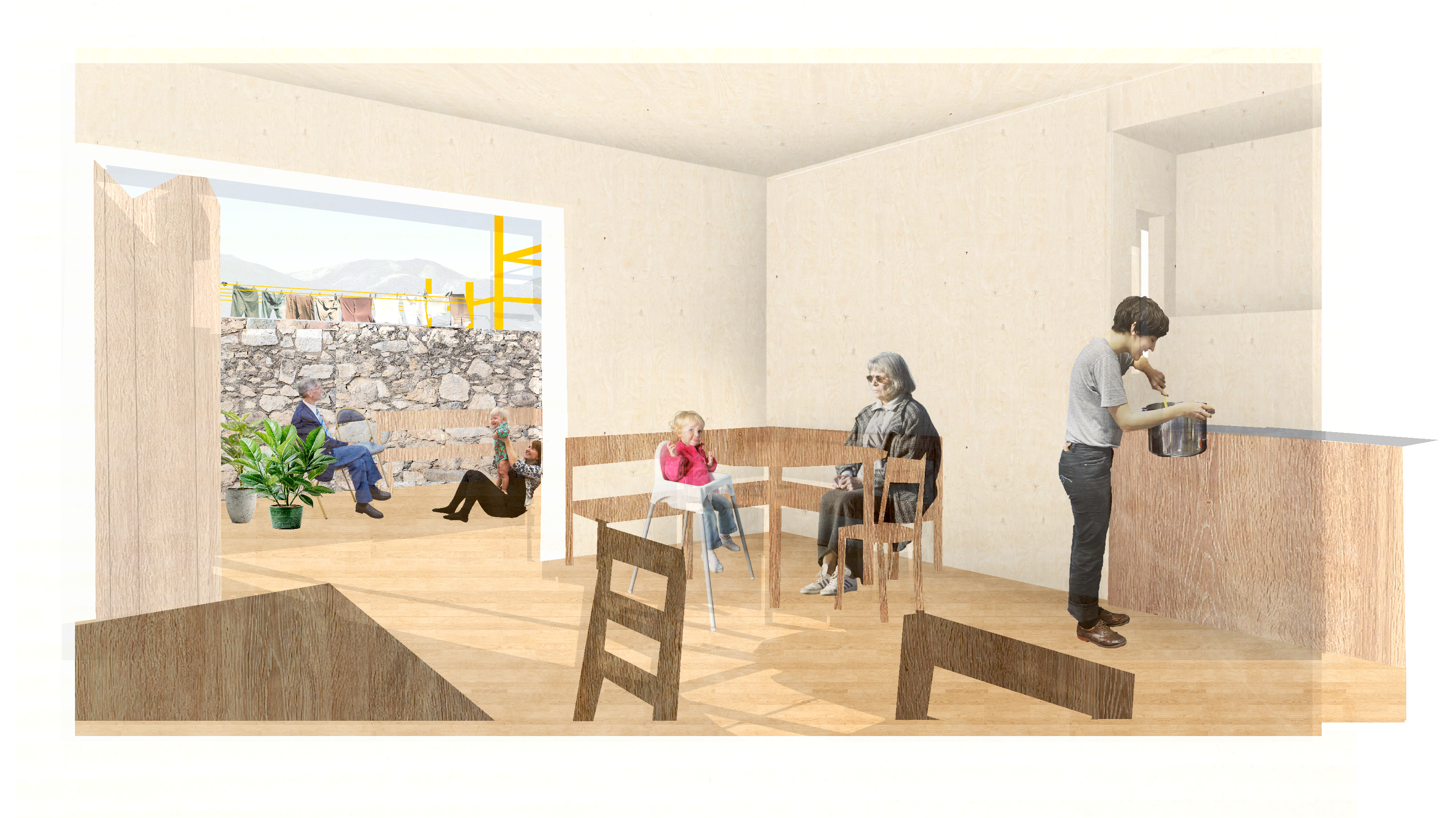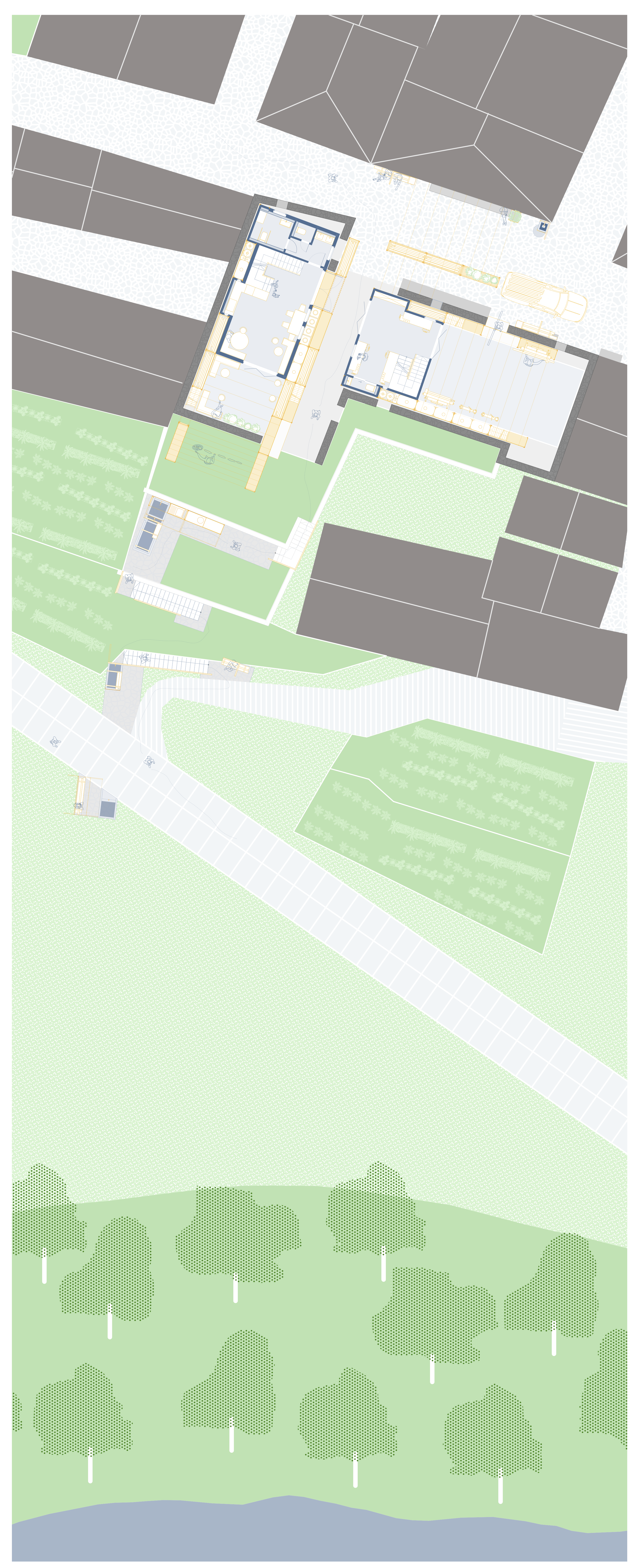 This marginalization of care work prompted research into infrastructure that could reverse this trend, eventually informing my design proposal: a toolbox of 10 interventions aimed at making care work visible and prompting its communalization. They range from practical solutions— such as a fountain to assist with cleaning (#002)—to more abstract ideas, such as a system for water reuse (#008). The proposal also includes an intergenerational day care center (#009) and a repair workshop (#010) that provides indoor space.