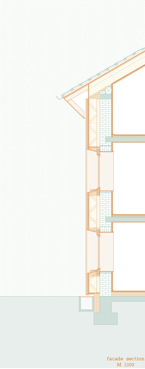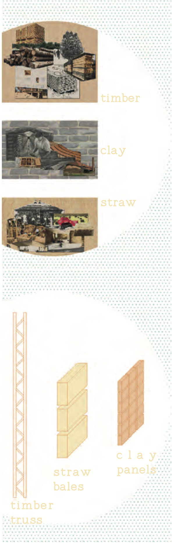 In a final step, this project tries to expand its logic into the the village of Terhagen and offers a solution to the long overdue renovation of some of the building stock. The landscape park can provide the necessary building materials, such as timber, strawbales and unfired clay, keeping the construttion costs down and reversing the long established logic of relying on externalising the production process of the building materials and their social impact.